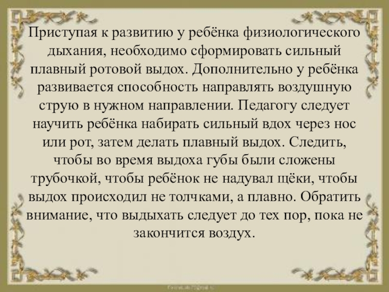 Слайд 2Приступая к развитию у ребёнка физиологического дыхания, необходимо сформировать сильный плавный