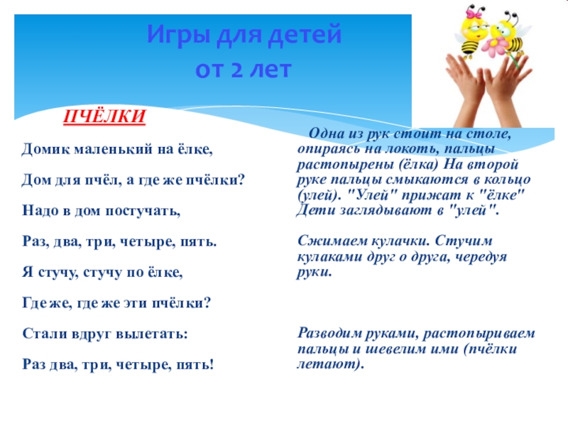 Одна из рук стоит на столе, опираясь на локоть, пальцы растопырены (ёлка) На второй руке пальцы смыкаются в кольцо (улей). "Улей" прижат к "ёлке" Дети заглядывают в "улей".