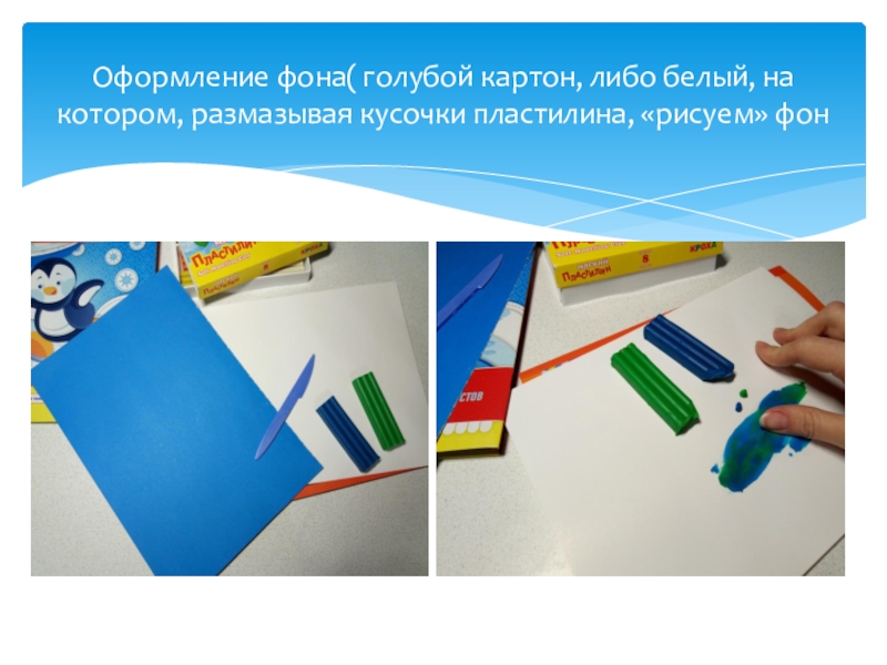 Слайд 4Оформление фона( голубой картон, либо белый, на котором, размазывая кусочки пластилина,