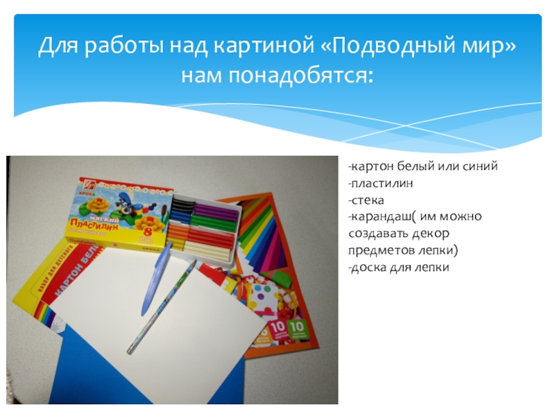 Для работы над картиной «Подводный мир» нам понадобятся:-картон белый или синий -пластилин -стека -карандаш( им можно создавать