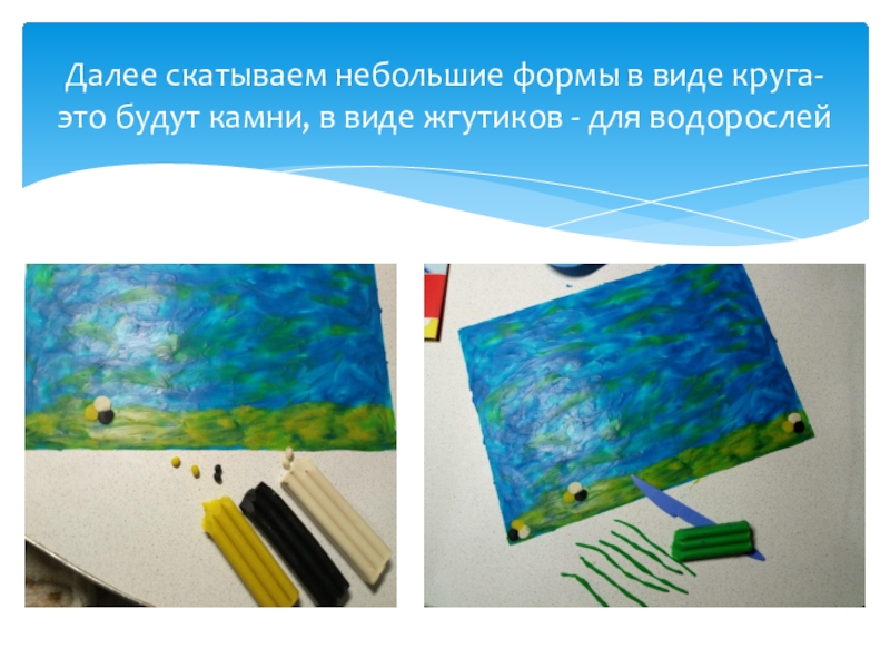 Далее скатываем небольшие формы в виде круга-это будут камни, в виде жгутиков - для водорослей