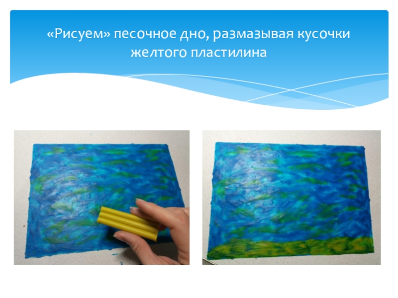 Слайд 5«Рисуем» песочное дно, размазывая кусочки желтого пластилина