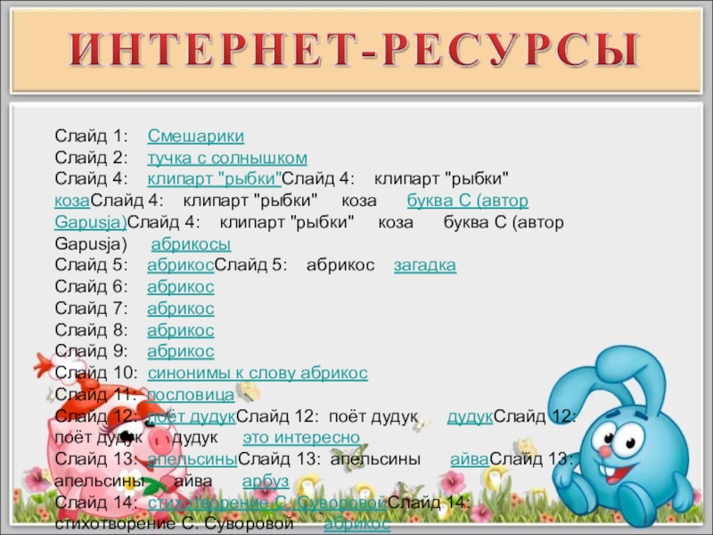 Это сайт презентаций, где можно хранить и обмениваться своими презентациями, докладами, проектами, шаблонами в формате PowerPoint с другими пользователями. Мы помогаем школьникам, студентам, учителям, преподавателям хранить и обмениваться учебными материалами.