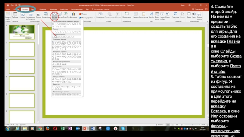 5. Табло состоит из фигур. Я составила из прямоугольников Для этого перейдите на вкладку Вставка, в окне Иллюстрации выберите Фигуры – прямоугольник: скругленные углы фигуры можно выбирать по своему усмотрению.