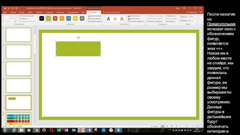 «+». Нажав им в любом месте на слайде, мы увидим, что появилась данная фигура, ее размер мы выбираем по своему усмотрению. Данные фигуры в дальнейшем будут обозначать категории в игре.