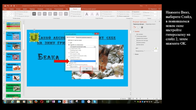 Слайд 23Нажмите Вниз, выберите Слайд, в появившемся новом окне настройте гиперссылку на