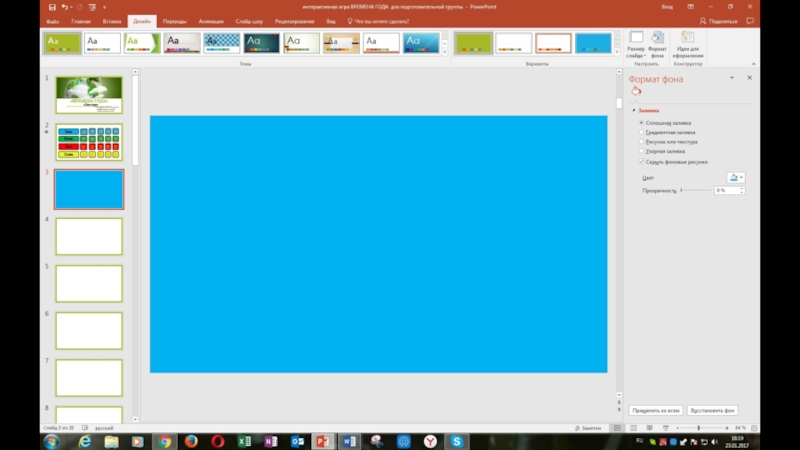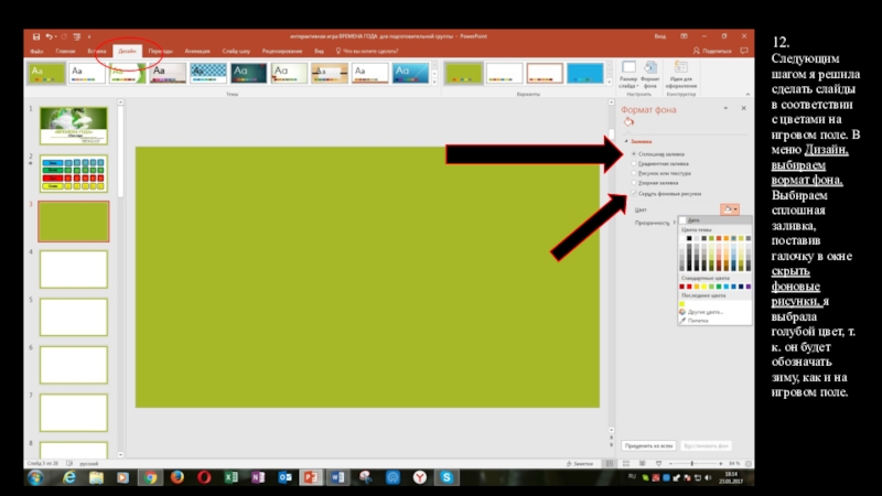 на игровом поле. В меню Дизайн, выбираем вормат фона. Выбираем сплошная заливка, поставив галочку в окне скрыть фоновые рисунки, я выбрала голубой цвет, т.к. он будет обозначать зиму, как и на игровом поле.