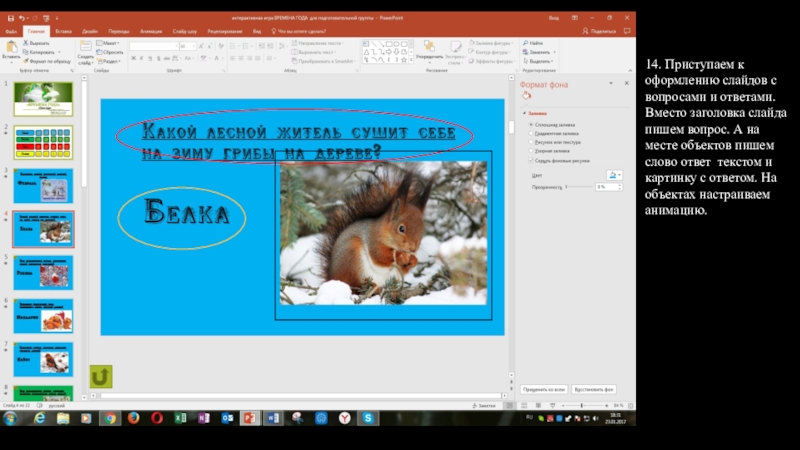 я приготовила заранее. Анимацию для картинок ответов и слов с ответами выбираем по своему усмотрению.