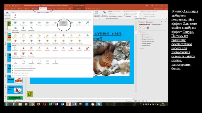 Слайд 17В меню Анимация выбираем понравившийся эффект. Для этого слайда я выбрала