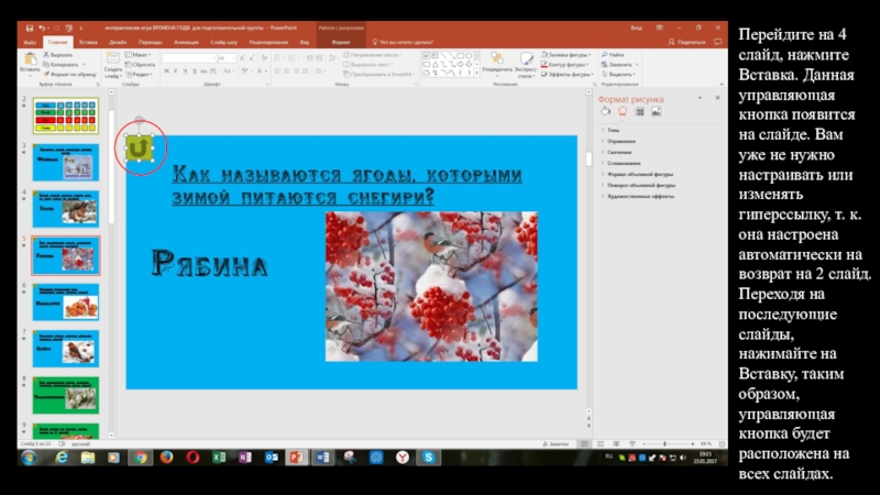 Слайд 25Перейдите на 4 слайд, нажмите Вставка. Данная управляющая кнопка появится на
