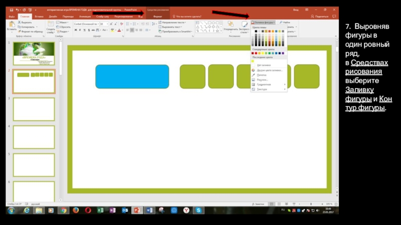 Слайд 77. Выровняв фигуры в один ровный ряд, в Средствах рисования