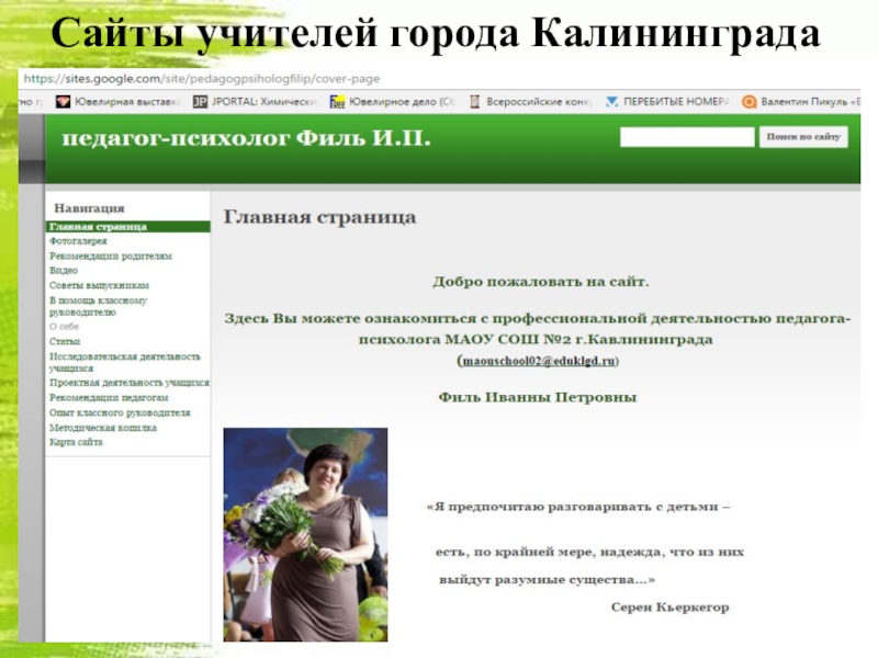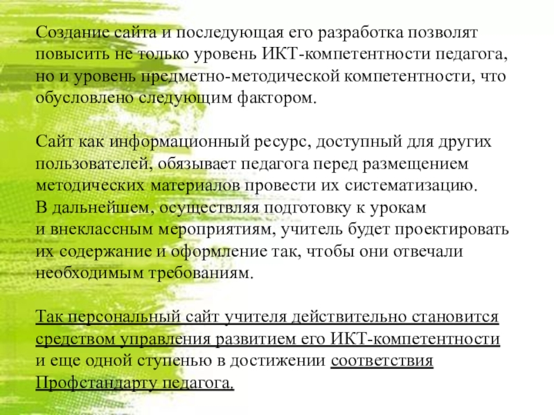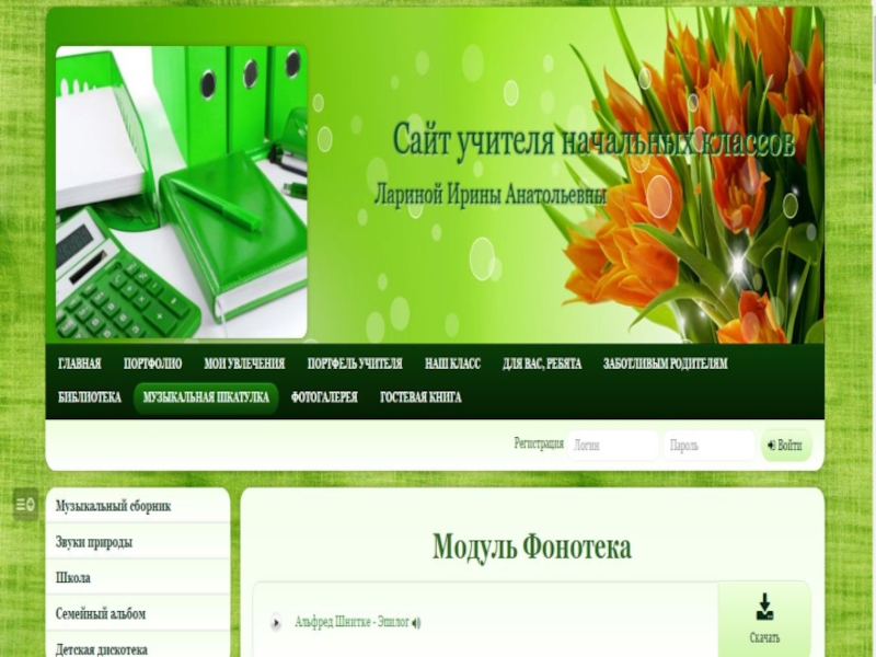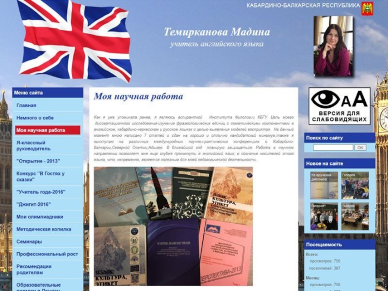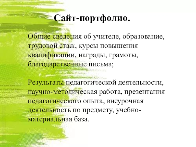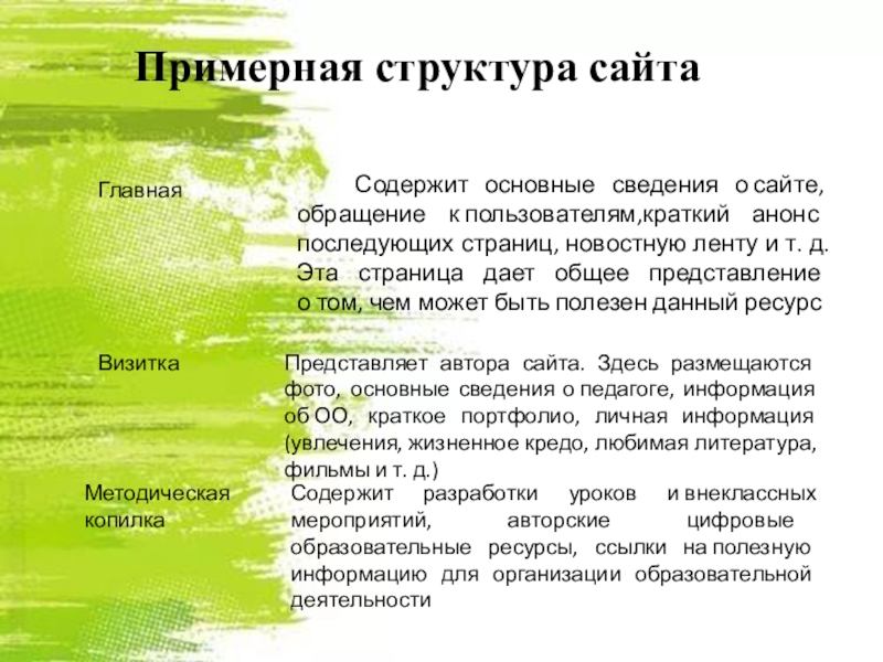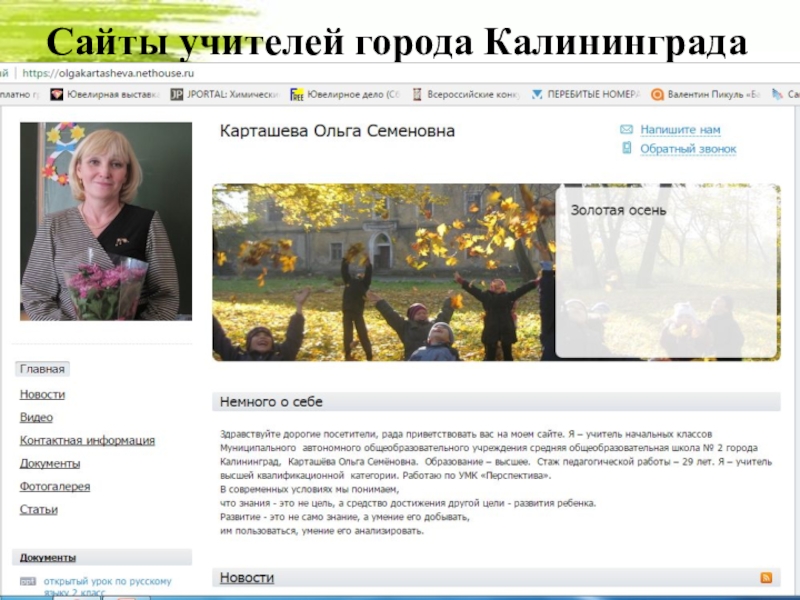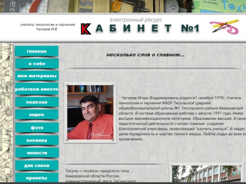 Представляет автора сайта. Здесь размещаются фото, основные сведения о педагоге, информация об ОО, краткое портфолио, личная информация (увлечения, жизненное кредо, любимая литература, фильмы и т. д.)