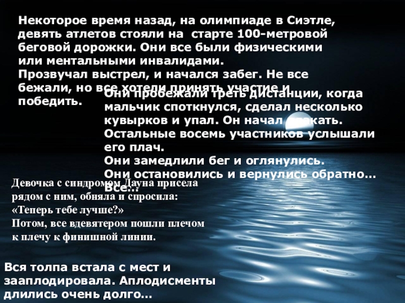 Потом, все вдевятером пошли плечом к плечу к финишной линии.