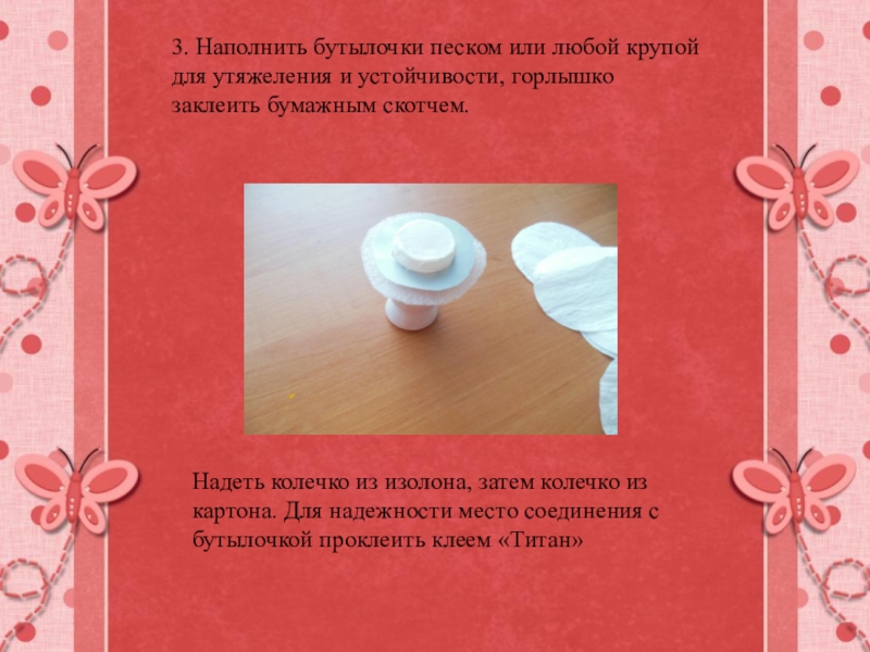 Надеть колечко из изолона, затем колечко из картона. Для надежности место соединения с бутылочкой проклеить клеем «Титан»