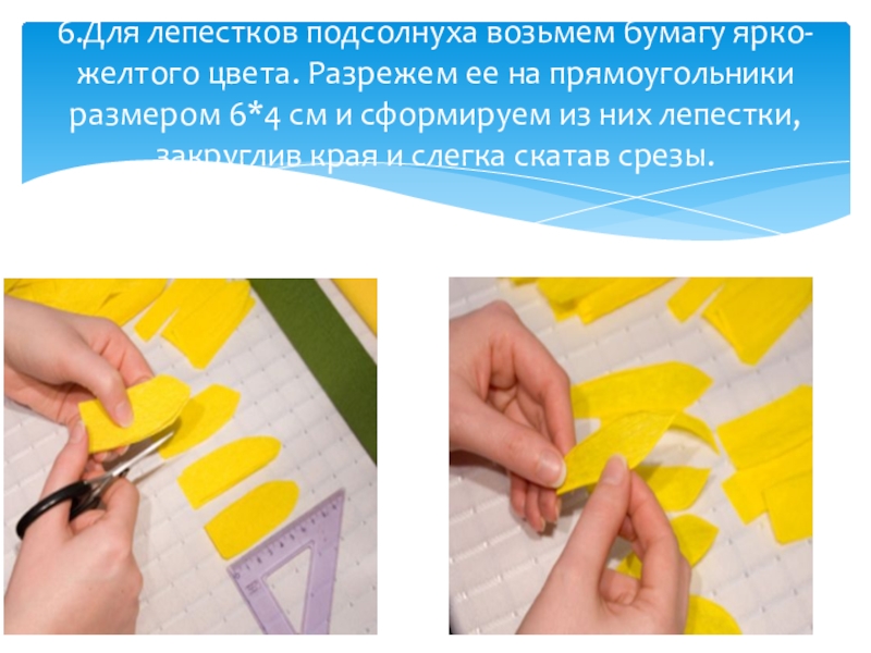 6.Для лепестков подсолнуха возьмем бумагу ярко-желтого цвета. Разрежем ее на прямоугольники размером 6*4 см и сформируем из