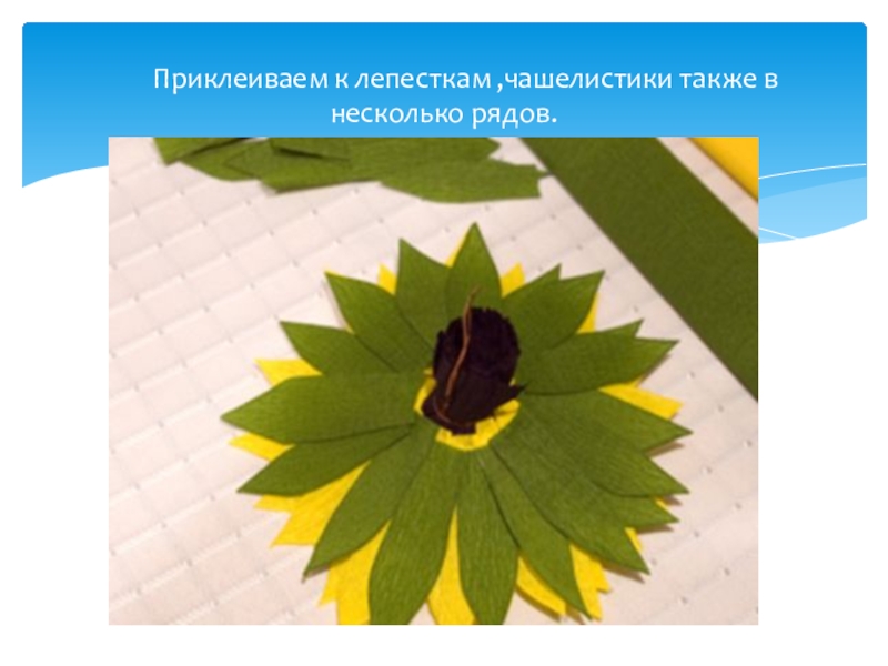 Слайд 15 Приклеиваем к лепесткам ,чашелистики также в несколько рядов.