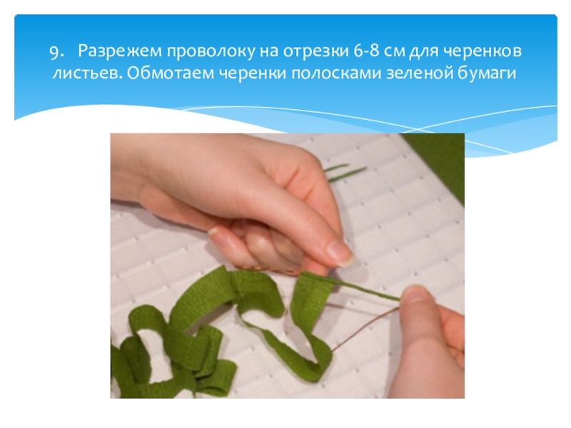 9.	Разрежем проволоку на отрезки 6-8 см для черенков листьев. Обмотаем черенки полосками зеленой бумаги