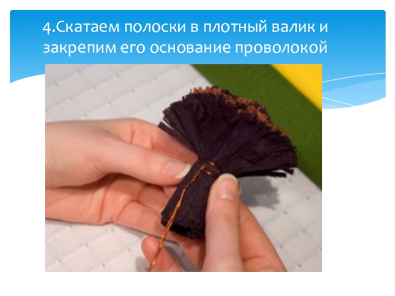 Слайд 74.Скатаем полоски в плотный валик и закрепим его основание проволокой