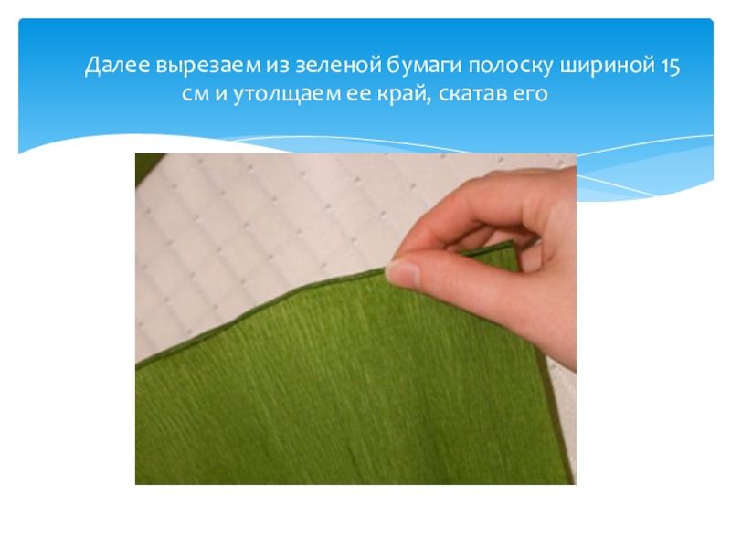 Слайд 17 Далее вырезаем из зеленой бумаги полоску шириной 15 см и утолщаем