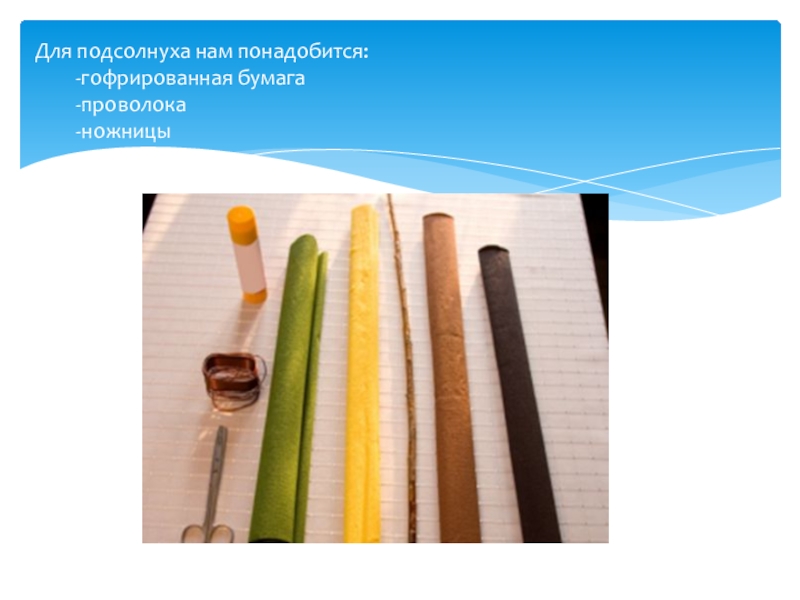 Слайд 3Для подсолнуха нам понадобится: -гофрированная бумага -проволока -ножницы -клей -небольшая ветка
