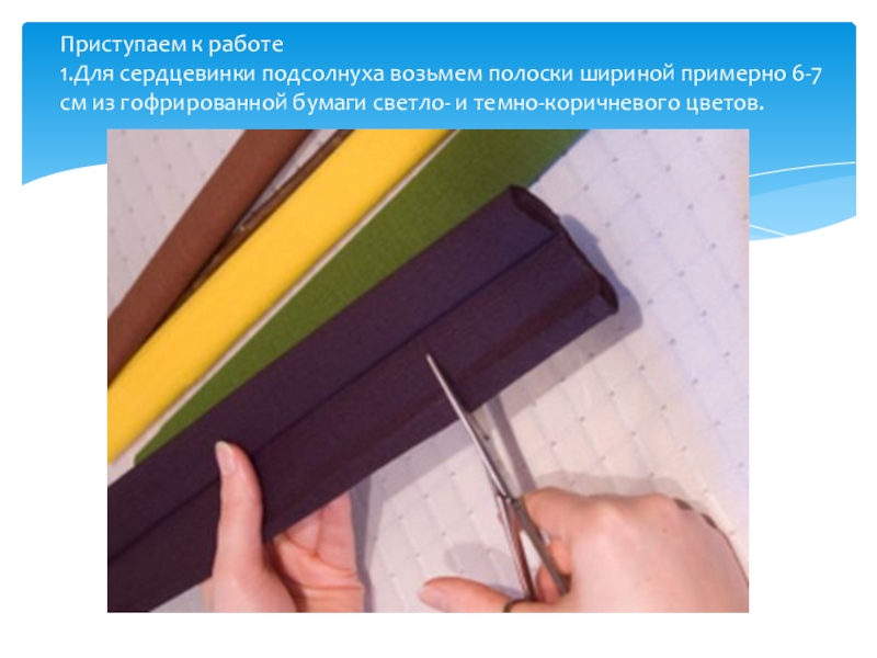 Слайд 4Приступаем к работе 1.Для сердцевинки подсолнуха возьмем полоски шириной примерно 6-7 см