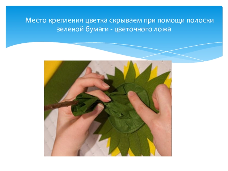 Слайд 19 Место крепления цветка скрываем при помощи полоски зеленой бумаги - цветочного