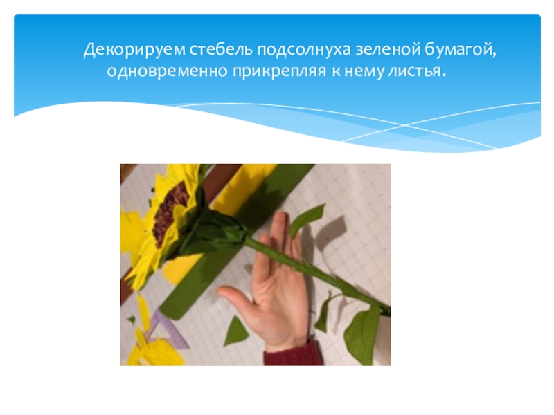 Слайд 20 Декорируем стебель подсолнуха зеленой бумагой, одновременно прикрепляя к нему листья.