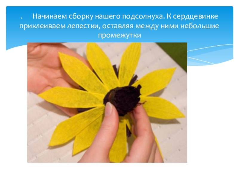 Слайд 14. Начинаем сборку нашего подсолнуха. К сердцевинке приклеиваем лепестки, оставляя между ними
