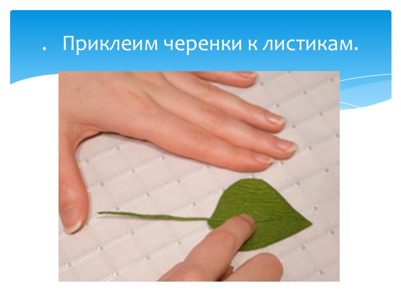 Слайд 13. Приклеим черенки к листикам.