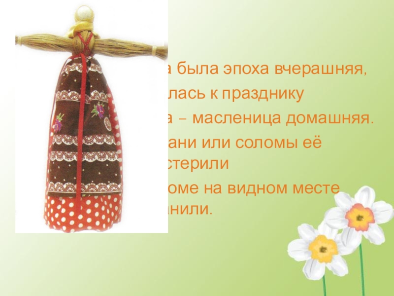 Когда была эпоха вчерашняя, Делалась к праздникуКукла – масленица домашняя.Из ткани или соломы её мастерилиИ в доме