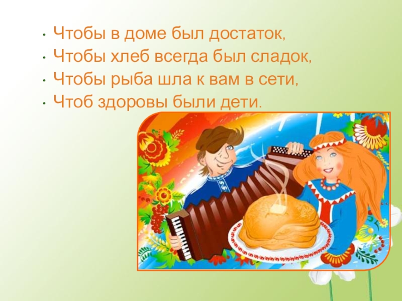 Чтобы в доме был достаток,Чтобы хлеб всегда был сладок,Чтобы рыба шла к вам в сети,Чтоб здоровы были