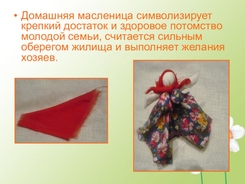Слайд 10Домашняя масленица символизирует крепкий достаток и здоровое потомство молодой семьи, считается