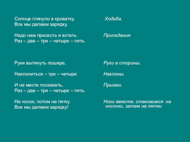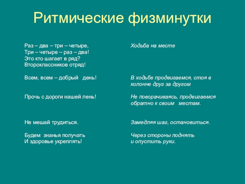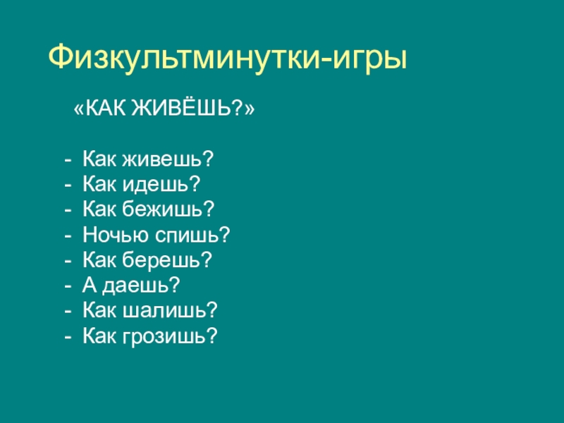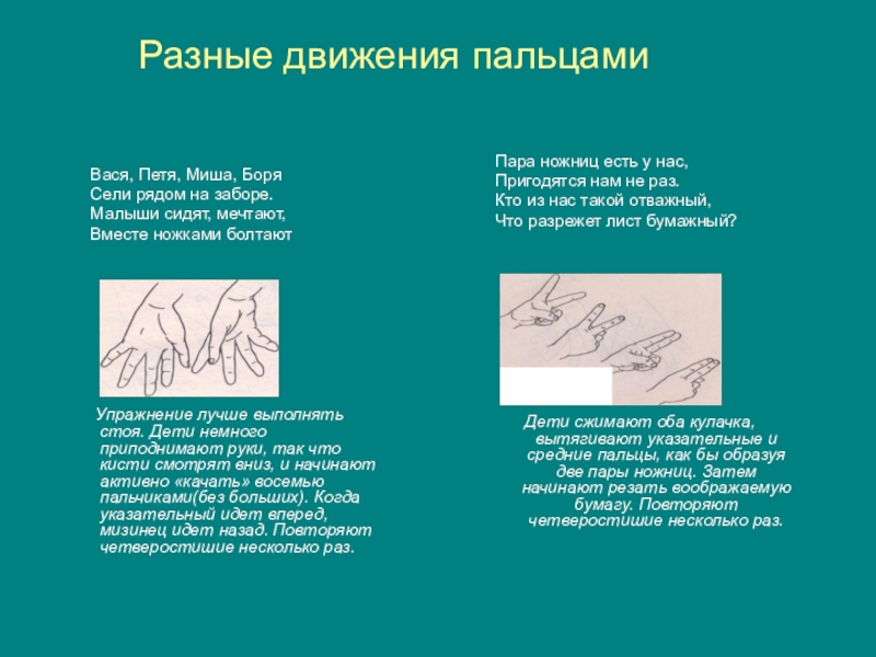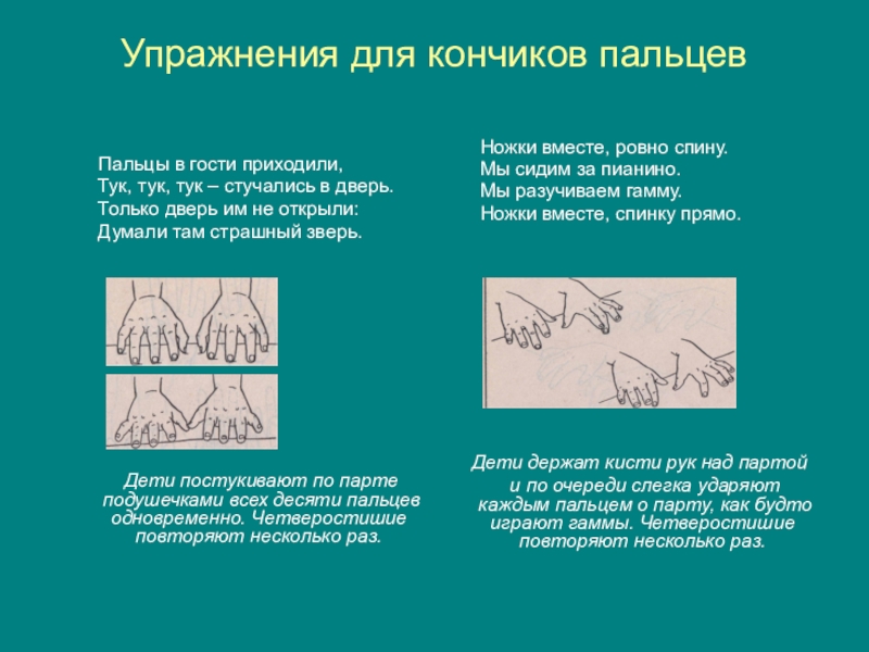 и по очереди слегка ударяют каждым пальцем о парту, как будто играют гаммы. Четверостишие повторяют несколько раз.