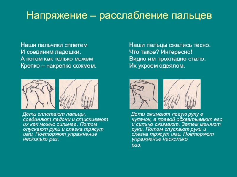 Дети сплетают пальцы, соединяют ладони и стискивают их как можно сильнее. Потом опускают руки и слегка трясут ими. Повторяют упражнение несколько раз.