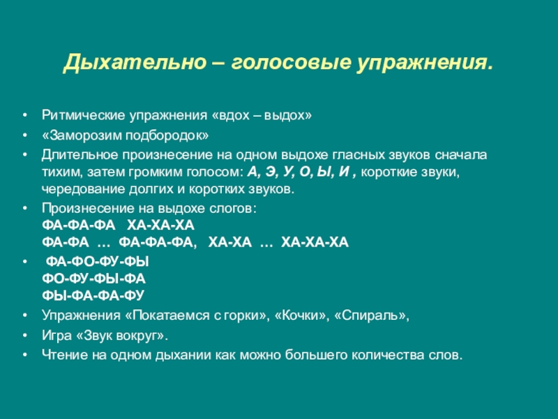 Произнесение на выдохе слогов: ФА-ФА-ФА ХА-ХА-ХА ФА-ФА … ФА-ФА-ФА, ХА-ХА … ХА-ХА-ХА
