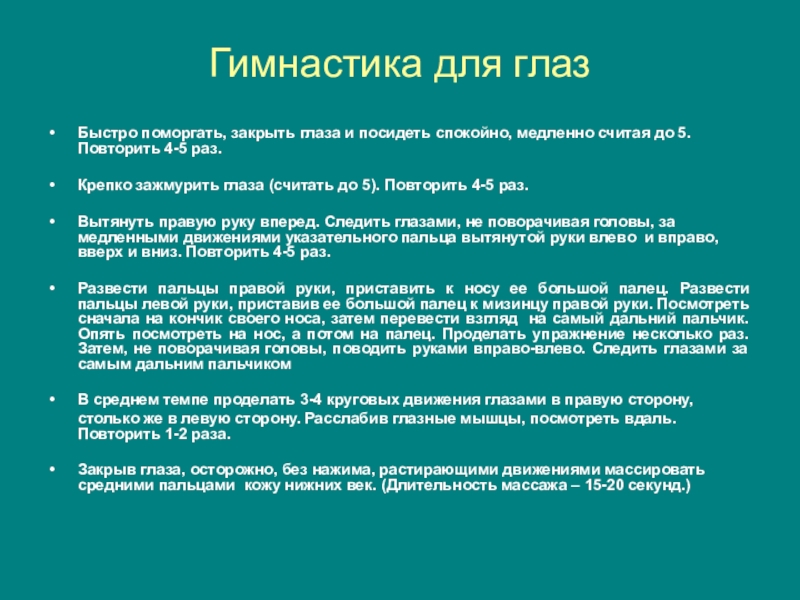 Крепко зажмурить глаза (считать до 5). Повторить 4-5 раз.