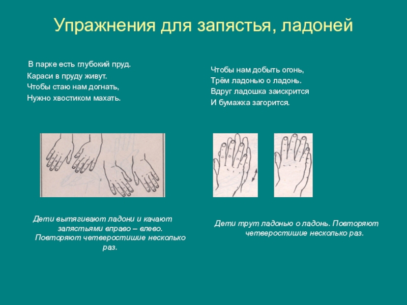 Дети вытягивают ладони и качают запястьями вправо – влево. Повторяют четверостишие несколько раз.