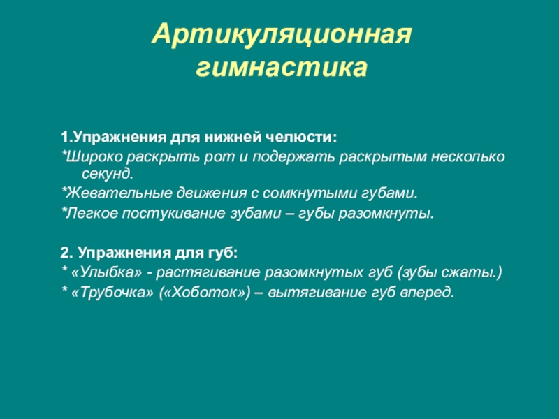 * «Трубочка» («Хоботок») – вытягивание губ вперед.