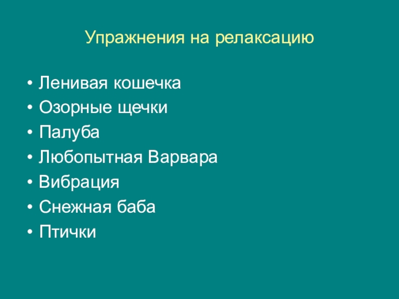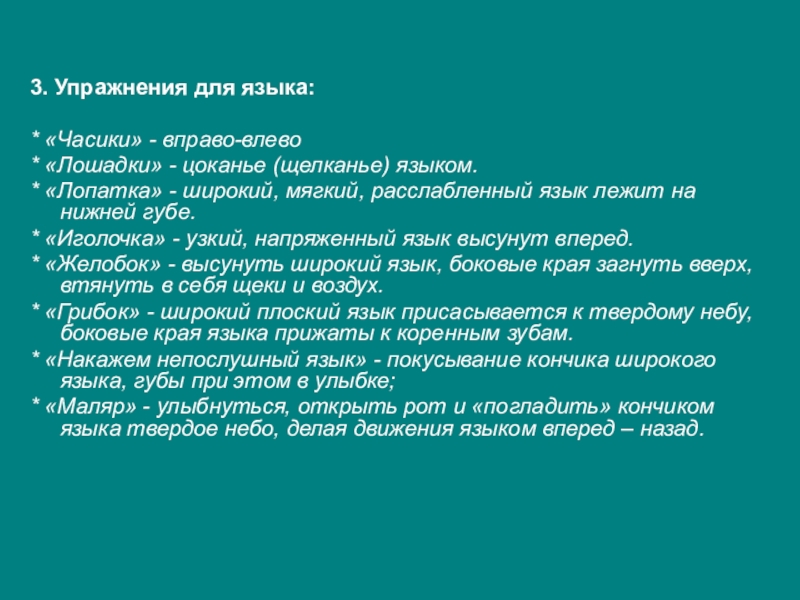 * «Накажем непослушный язык» - покусывание кончика широкого языка, губы при этом в улыбке;