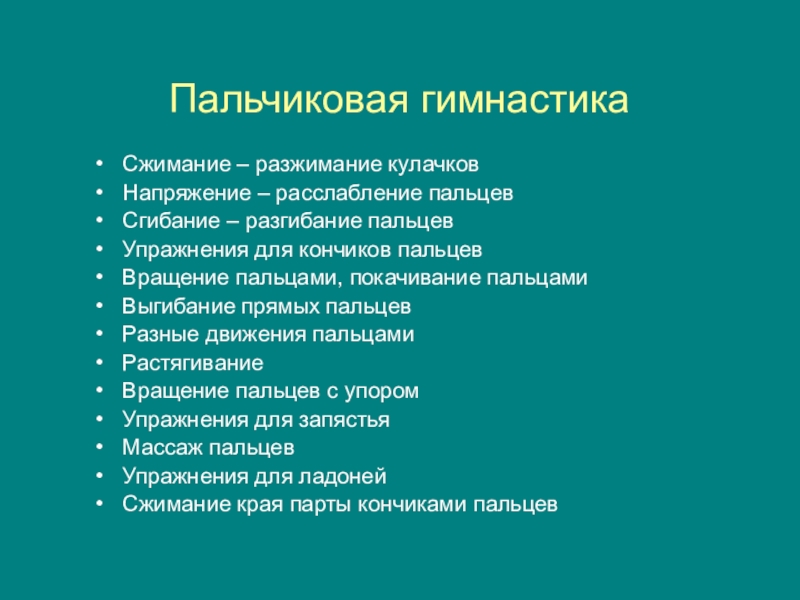 Дети вытягивают руки вперёд, сжимают пальцы в кулачки как можно сильнее, а затем расслабляют их и разжимают. Повторяют упражнение несколько раз.