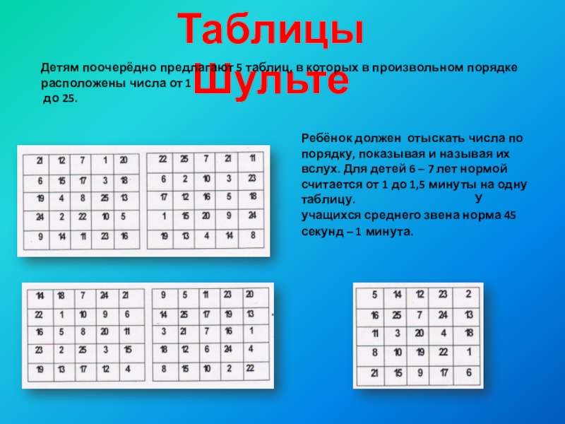 Детям поочерёдно предлагают 5 таблиц, в которых в произвольном порядке расположены числа от 1