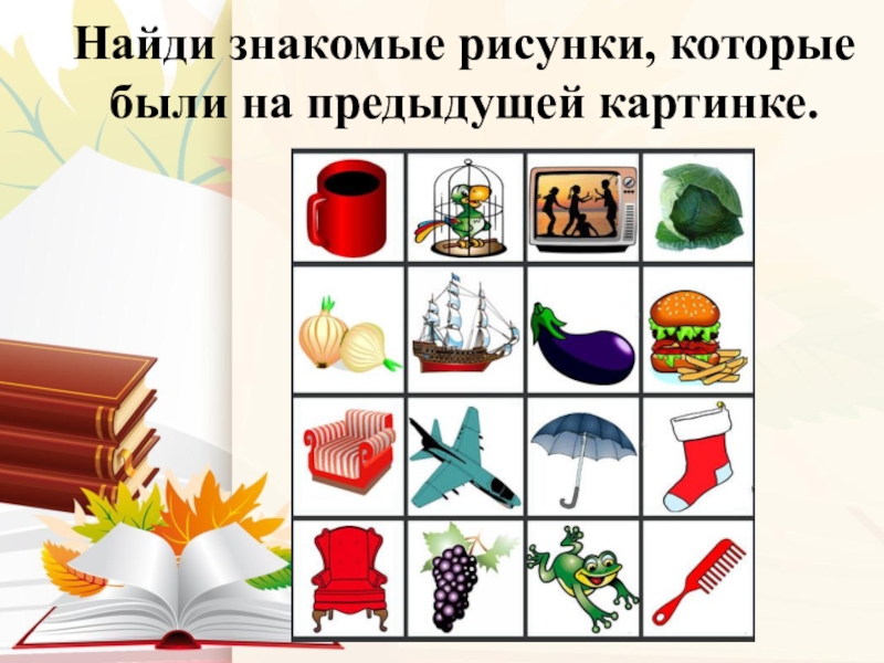 Слайд 11Найди знакомые рисунки, которые были на предыдущей картинке.