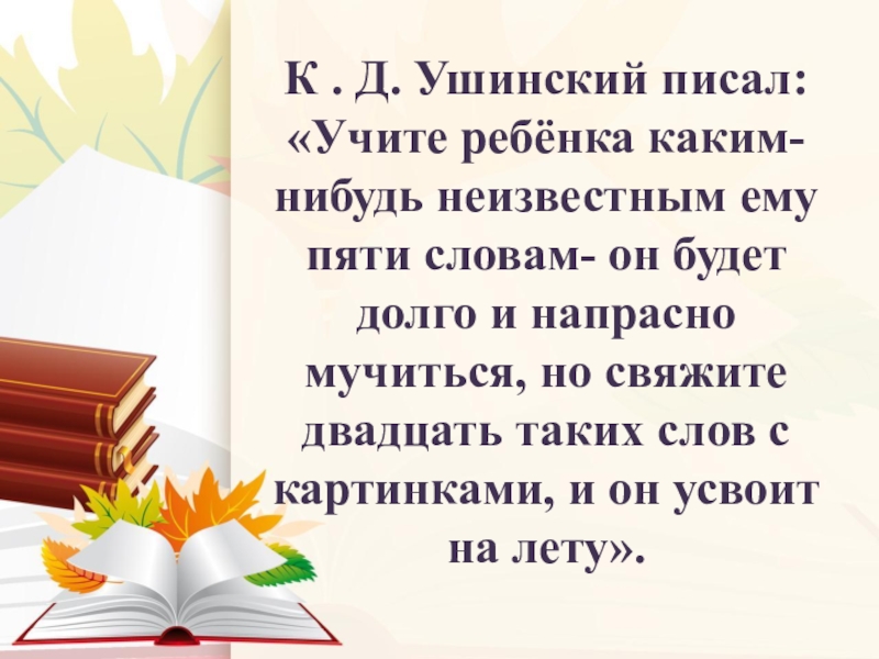 К . Д. Ушинский писал:«Учите ребёнка каким-нибудь неизвестным ему пяти словам- он будет долго и напрасно мучиться,
