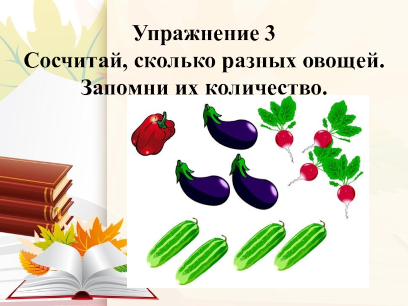 Упражнение 3 Сосчитай, сколько разных овощей. Запомни их количество.