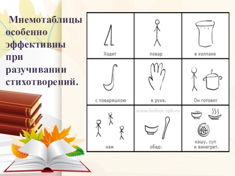 Слайд 22 Мнемотаблицы особенно эффективны при разучивании стихотворений.