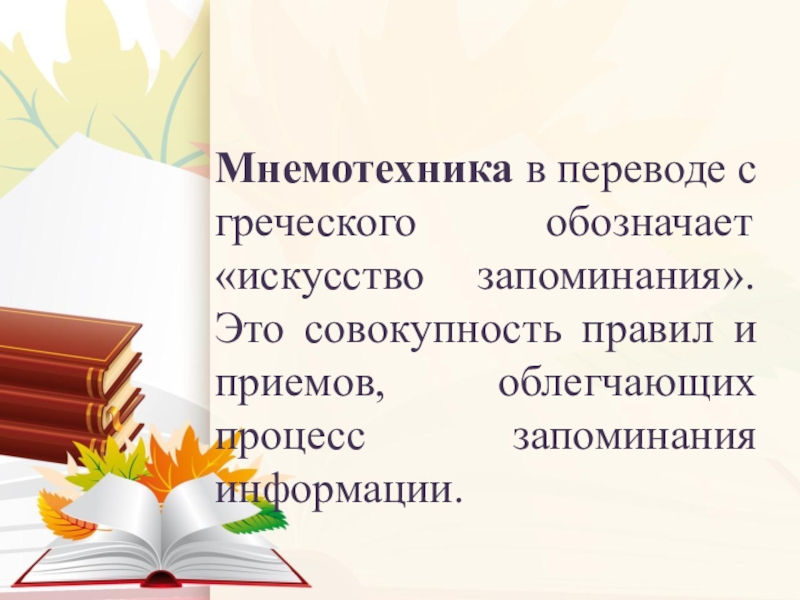 Мнемотехника в переводе с греческого обозначает «искусство запоминания». Это совокупность правил и приемов, облегчающих процесс запоминания информации.