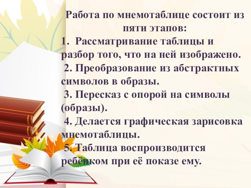 Слайд 21Работа по мнемотаблице состоит из пяти этапов: