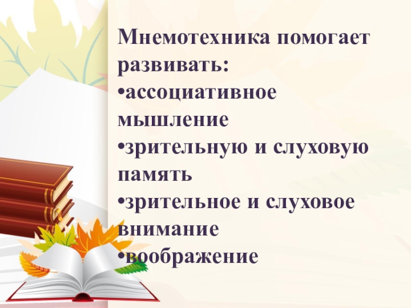 Мнемотехника помогает развивать:•ассоциативное мышление •зрительную и слуховую память •зрительное и слуховое внимание •воображение