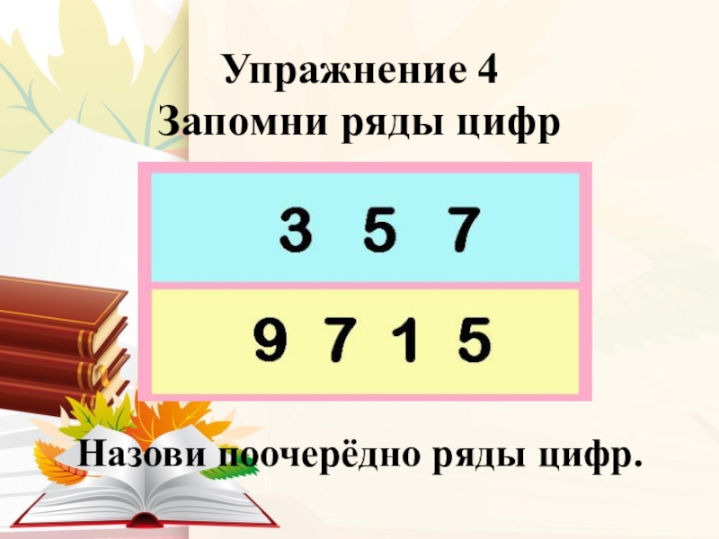 Упражнение 4 Запомни ряды цифрНазови поочерёдно ряды цифр.