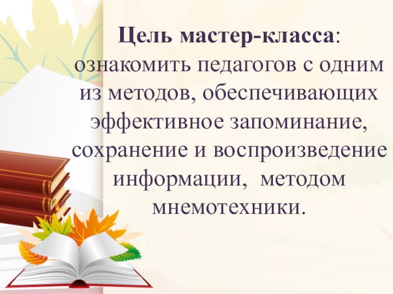 Слайд 3Цель мастер-класса: ознакомить педагогов с одним из методов, обеспечивающих эффективное запоминание,